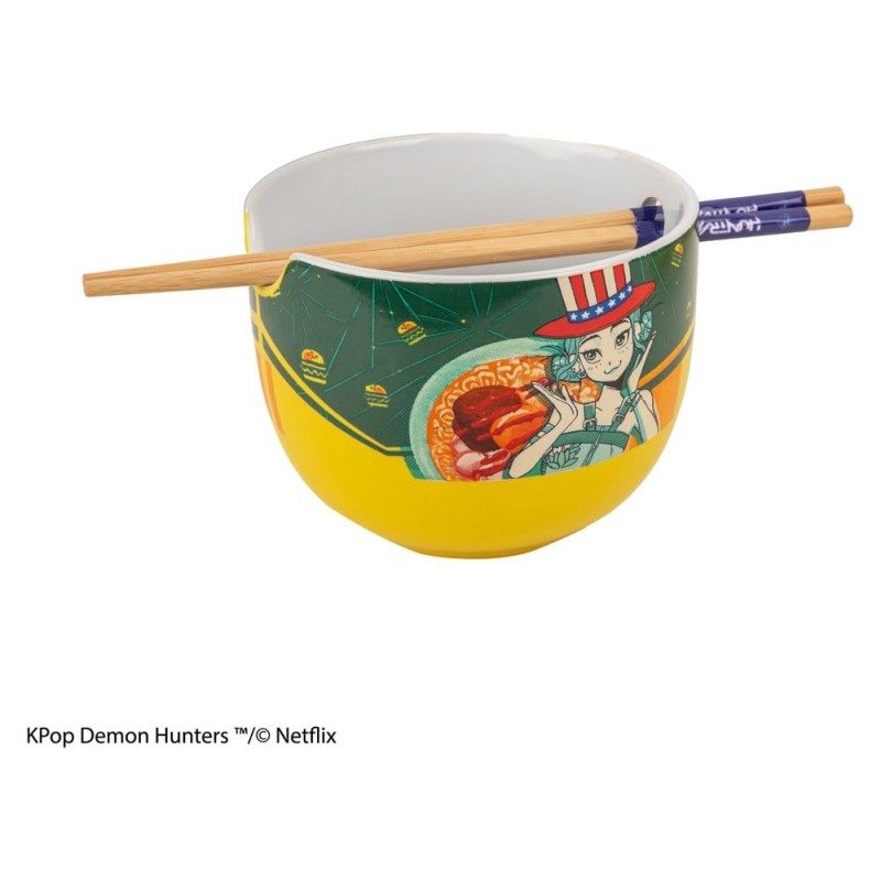 This KPop Demon Hunters Ramen Bowl with Chopsticks is an officially licensed product from Cinereplicas. The bowl is made of ceramic and the chopsticks are bamboo.